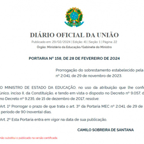 Prorrogação do sobrestamento estabelecido pela Portaria MEC nº 2.041, de 29 de novembro de 2023.