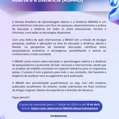 Chamada para submissão de artigos na Revista Brasileira de Aprendizagem Aberta e a Distância - RBAAD