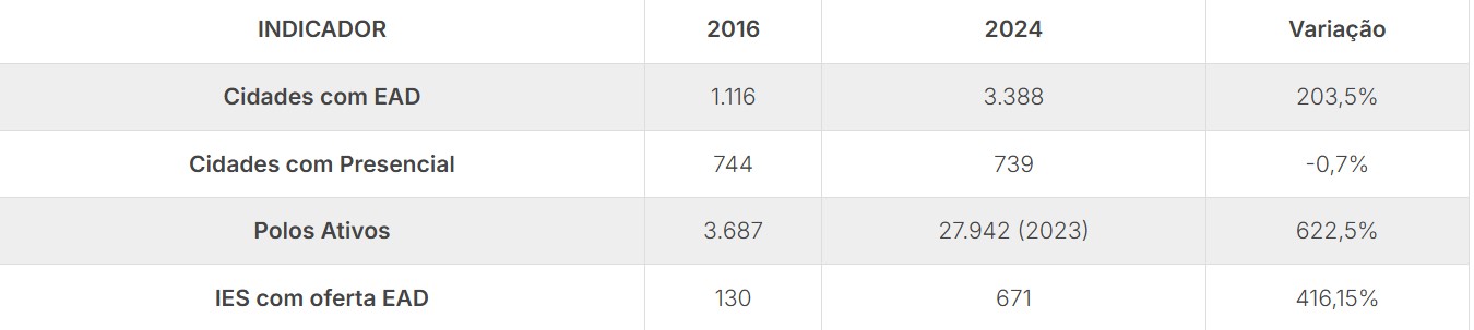 O Decreto nº 9.057, de 25 de maio de 2017, impulsionou a educação a distância (EAD) ao flexibilizar a abertura de novos polos. O resultado foi um crescimento exponencial: entre 2016 e 2024, o número de cidades com oferta de graduação privada saltou de  1.258 para 3.393, elevando a cobertura territorial de 22,58% para 60,91%.