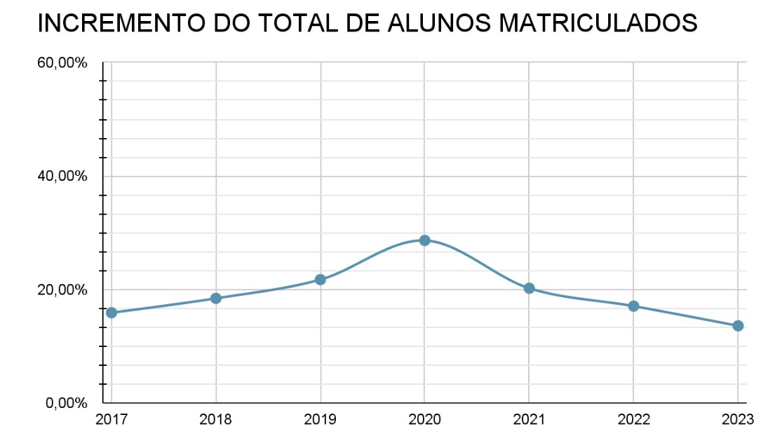 Falando da expansão da EaD, no período citado, não há como não relacionar com a pandemia de Covid-19, que restringiu a circulação e aglomeração de pessoas nos anos de 2020 e 2021. Contudo, ao contrário do que eventualmente se supõe, a expansão da oferta de cursos a distância não sofreu a variação mais significativa nestes anos de emergência sanitária. Embora o evento tenha impactado diretamente no ingresso de novos alunos, a análise da evolução do número de polos mostra que os maiores crescimentos ocorreram entre 2017 e 2019, impulsionados principalmente pelo decreto 9.057 que regulamentou a modalidade. Ou seja, se a pandemia ajudou a popularizar a EaD e atrair mais estudantes, o processo de expansão da oferta já estava em andamento – e de forma mais acentuada nos anos anteriores. Os gráficos abaixo comparam as variações dessas duas métricas.